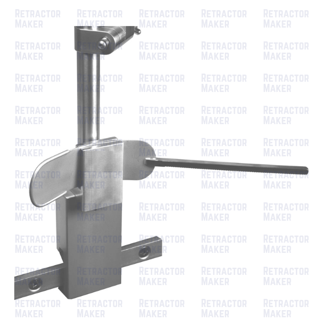 The blade bender is mounted onto the Bookwalter field post with space below the horizontal bar. The malleable blade is inserted into the slot, then gently bent to the desired shape for proper surgical exposure.