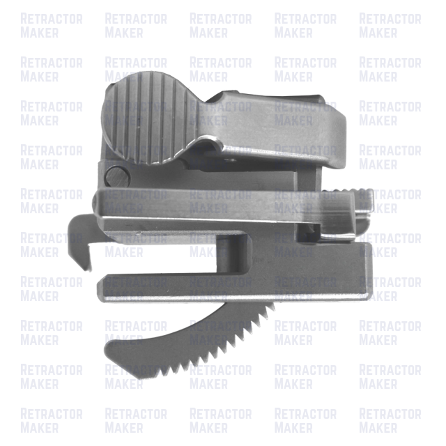 The Bookwalter Self-Retaining Tilt Ratchet is designed to securely hold retractor blades on the Bookwalter ring during surgery. It features an independent spring-loaded clip that snaps firmly onto the ring, helping prevent the ratchet from slipping or falling off during procedures.